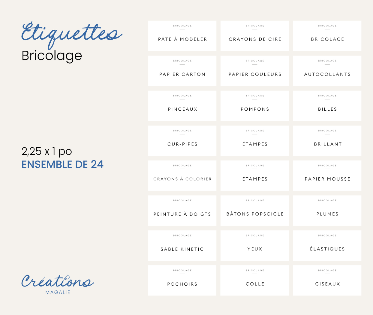 Transformez votre espace de loisirs créatifs en un coin bien ordonné grâce à ces étiquettes résistantes et imperméables. Parfaites pour identifier vos fournitures de bricolage, elles vous permettent de retrouver rapidement colles, pinceaux, papiers, perles et autres accessoires essentiels à votre créativité.