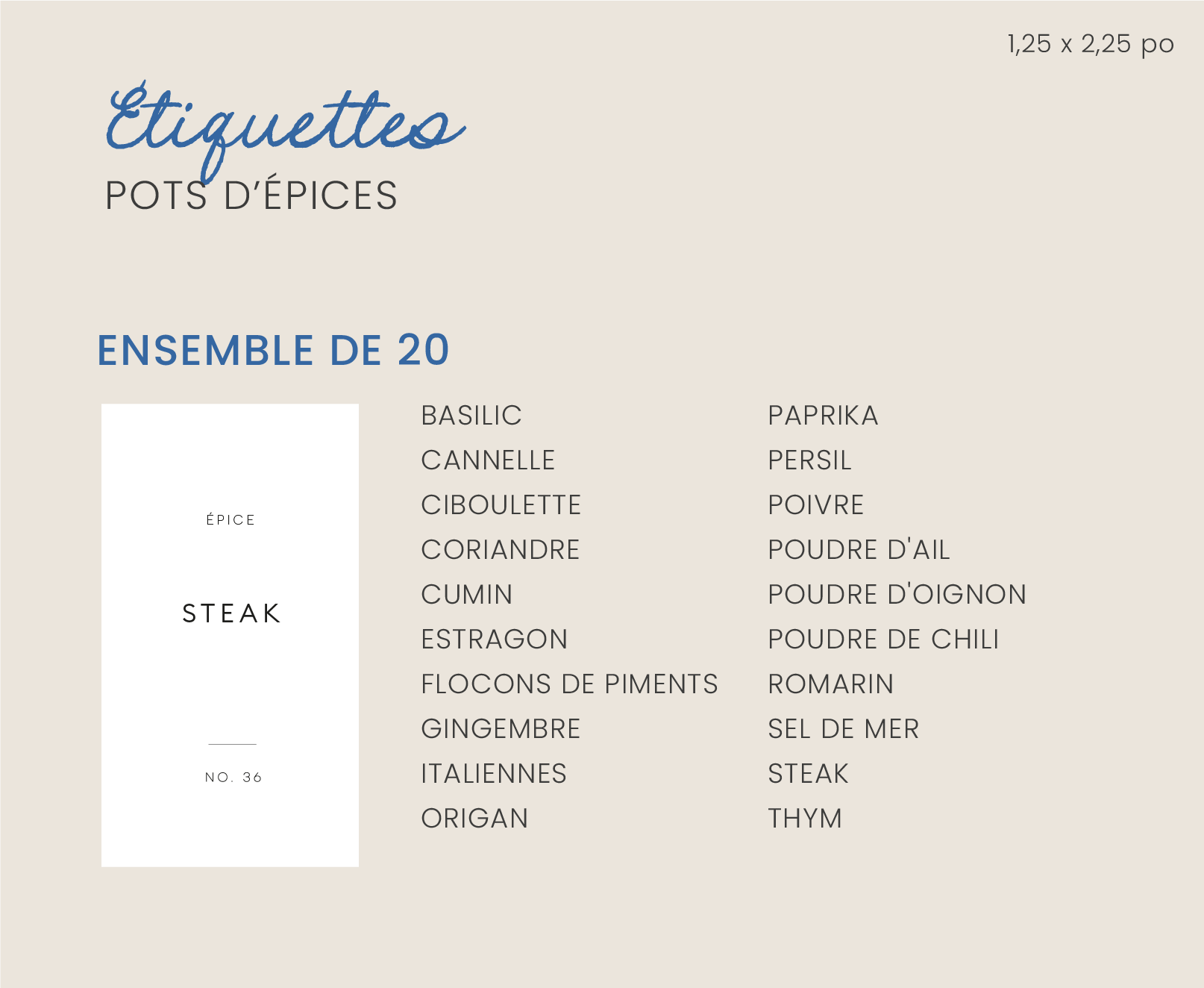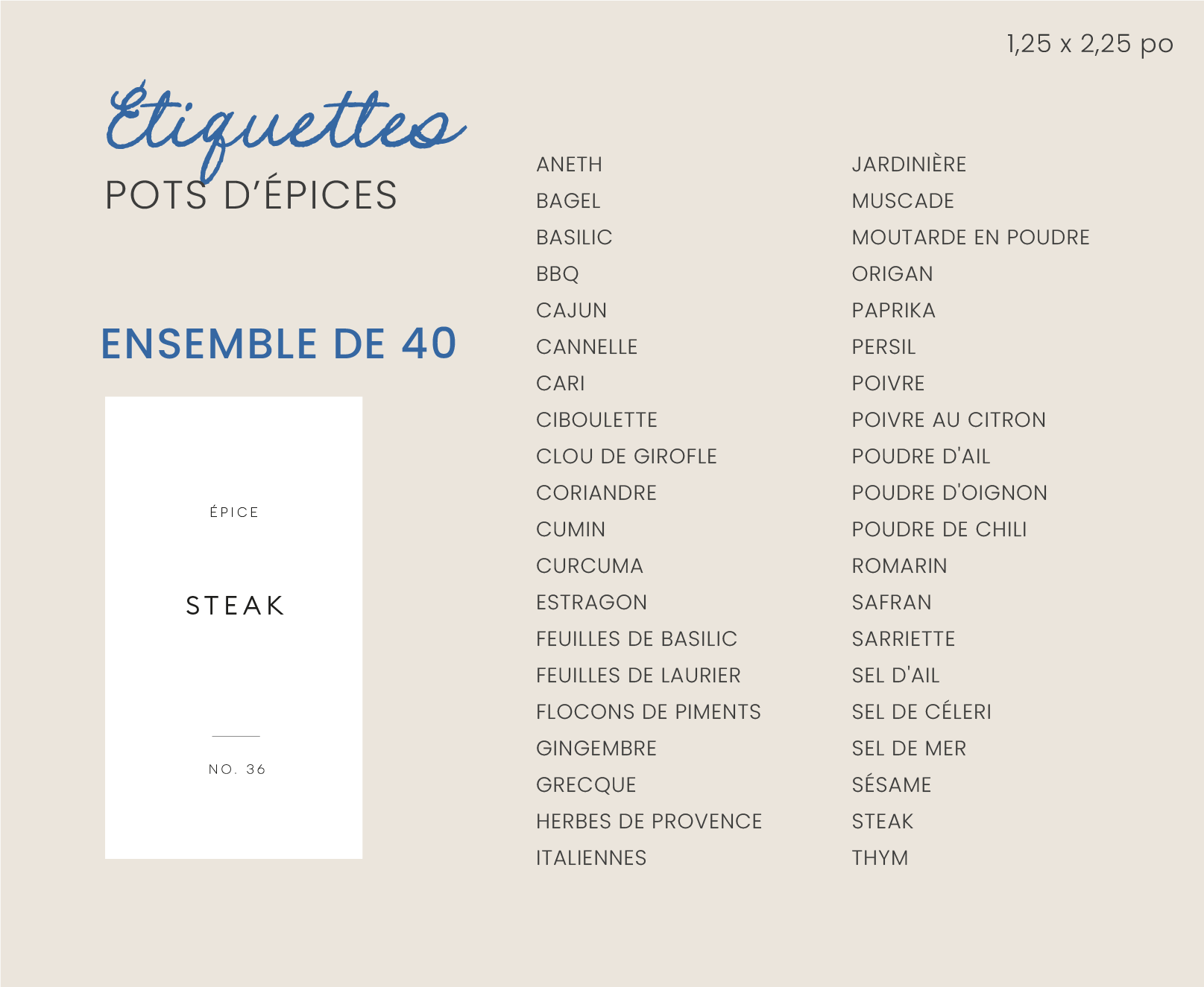 Organisez vos pots à épices avec style tout en facilitant votre quotidien. Grâce à ces étiquettes blanches épurées, vous retrouverez facilement chaque ingrédient et apporterez une touche esthétique à vos étagères.
