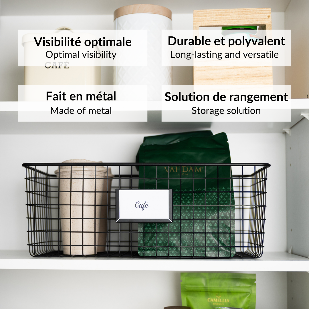 Le panier en métal Véronique allie robustesse et esthétisme. Conçu pour offrir un stockage polyvalent, il s’adapte à toutes les pièces de la maison, du bureau à la salle de bain. Sa construction en métal solide garantit une utilisation à long terme, tandis que ses deux étiquettes blanches cartonnées incluses permettent une identification facile de son contenu.