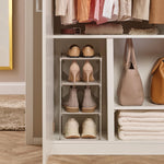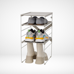 Dotée d’étagères réglables, cette étagère s’adapte facilement à différents types et tailles de chaussures, incluant baskets, talons, chaussures plates et bottes. Elle peut contenir jusqu’à 4 paires de chaussures, tout en maximisant l’espace vertical grâce à son design empilable.