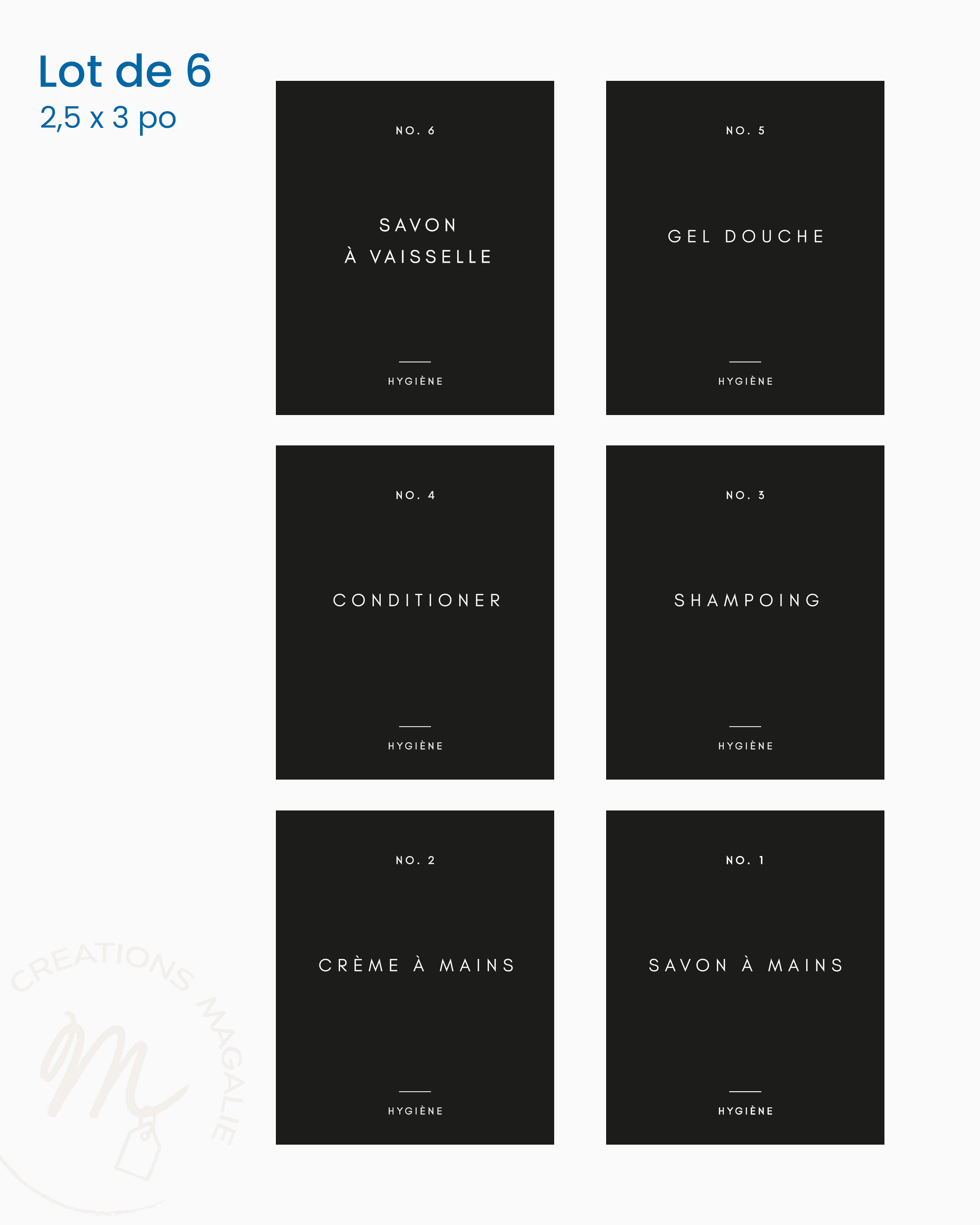 - 6 waterproof black labels (hand soap, shampoo, conditioner, shower gel, hand cream, dish soap)