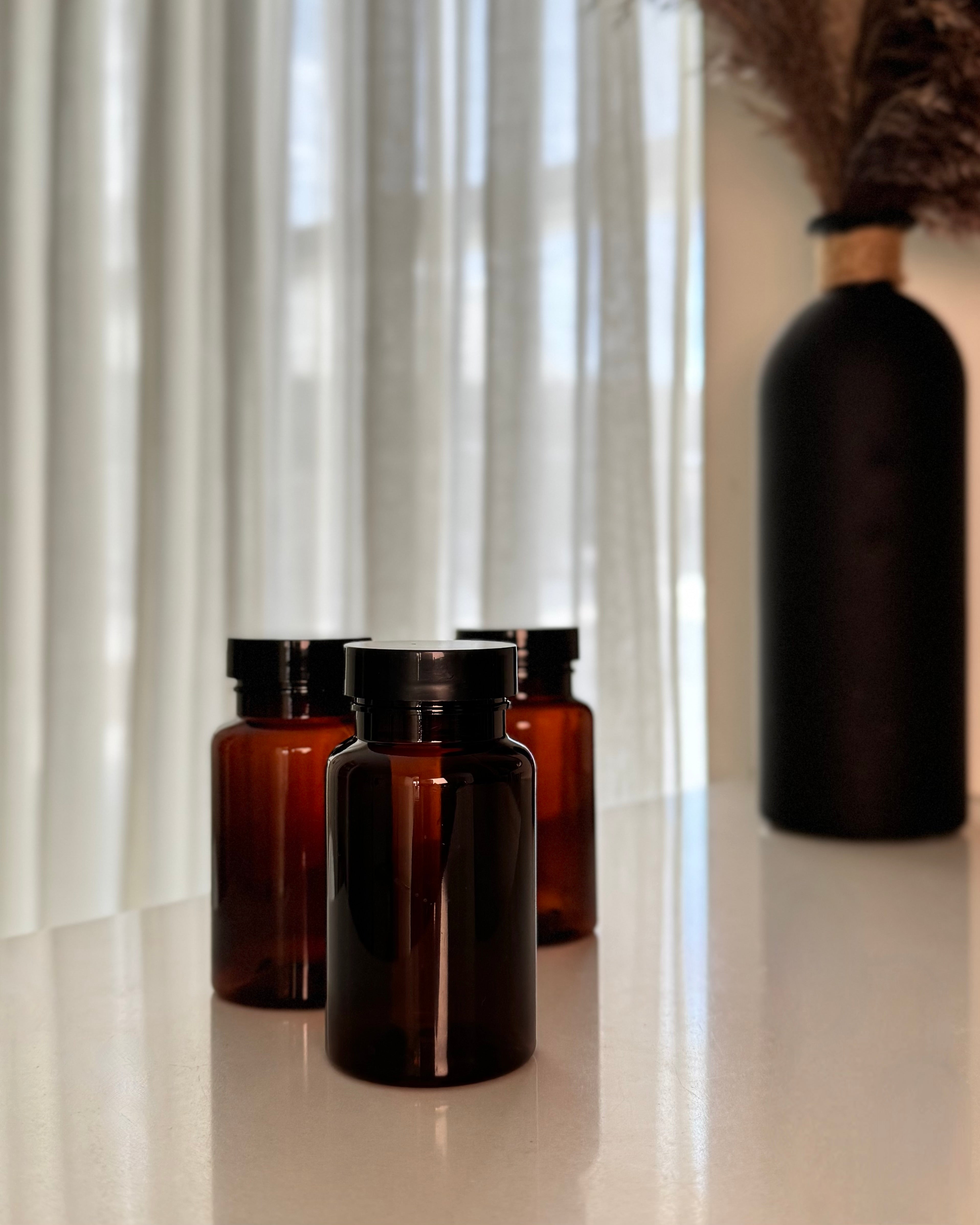 Keep your medications, vitamins and supplements organized with this set of three Eve amber bottles, perfect for practical, harmonious storage. Made from high-quality plastic, these bottles offer optimum protection against light to preserve the efficacy of your tablets and capsules for longer.