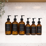 Transform your bathroom into an organized, elegant, and cohesive space with our complete set of amber glass bottles. This set includes 3x 500 ml bottles, 3x 250 ml bottles, and 6 waterproof black labels, perfect for identifying your products.