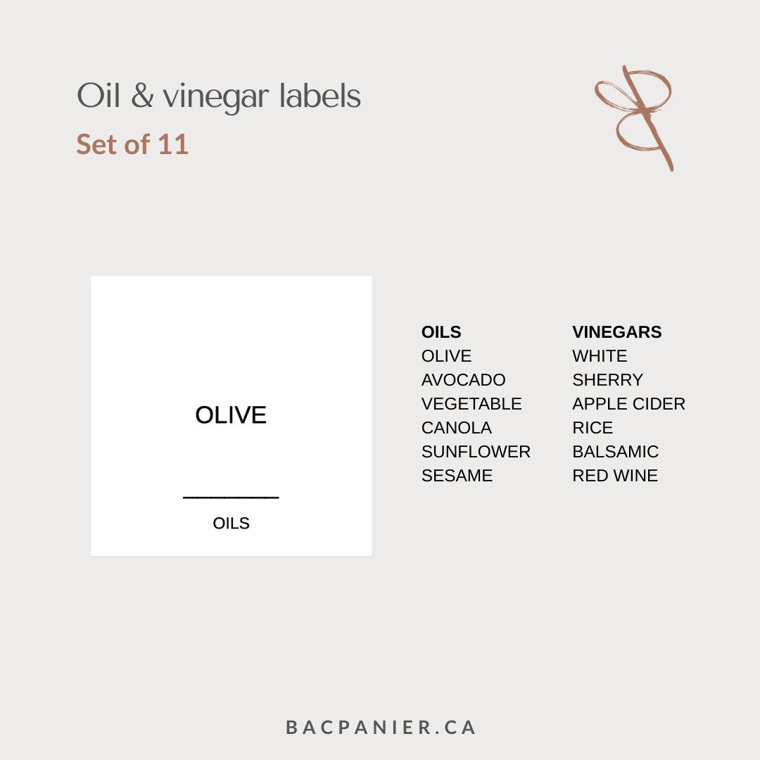Simplify your kitchen organization with our waterproof labels for oils and vinegars, designed to combine functionality, durability, and aesthetics. They make it easy to identify each oil or vinegar while creating a uniform, neat, and refined appearance.