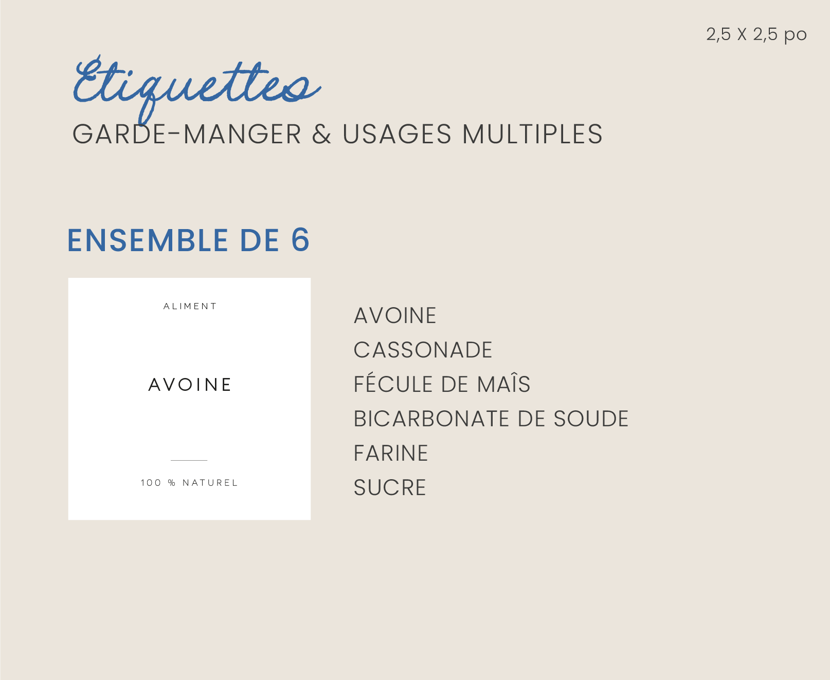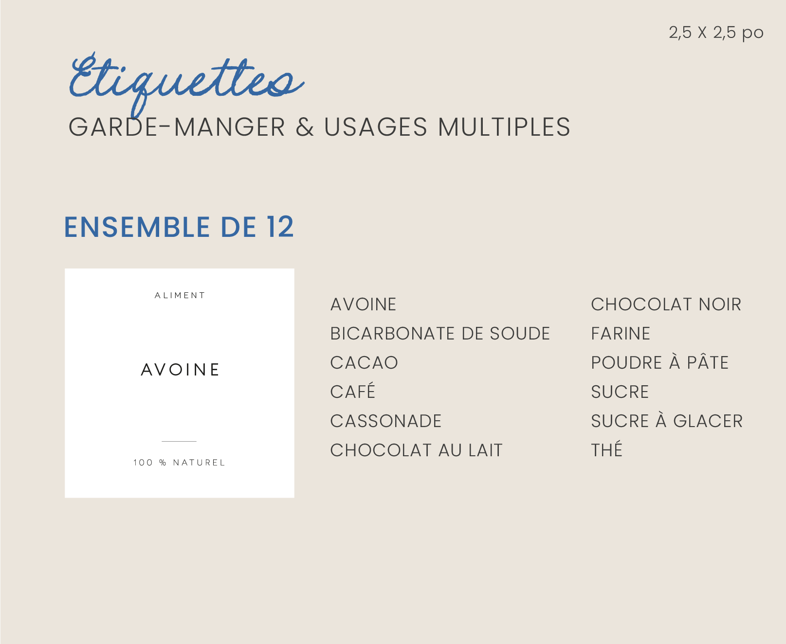 Optimisez et embellissez votre cuisine avec nos étiquettes spécialement conçues pour le garde-manger. Pratiques et esthétiques, elles vous permettent d’identifier facilement vos ingrédients tout en apportant une touche de style à vos bocaux et contenants alimentaires.