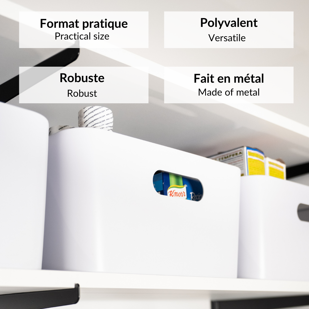 Le panier est fabriqué en métal durable, conçu pour résister à une utilisation quotidienne. Son format permet de le placer facilement dans des étagères ou des placards. Que vous souhaitiez un rangement pour vos produits de beauté, vos produits alimentaires ou vos accessoires de bureau, ce panier en métal est la solution idéale.